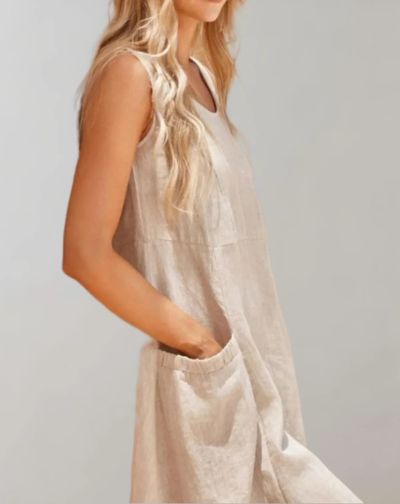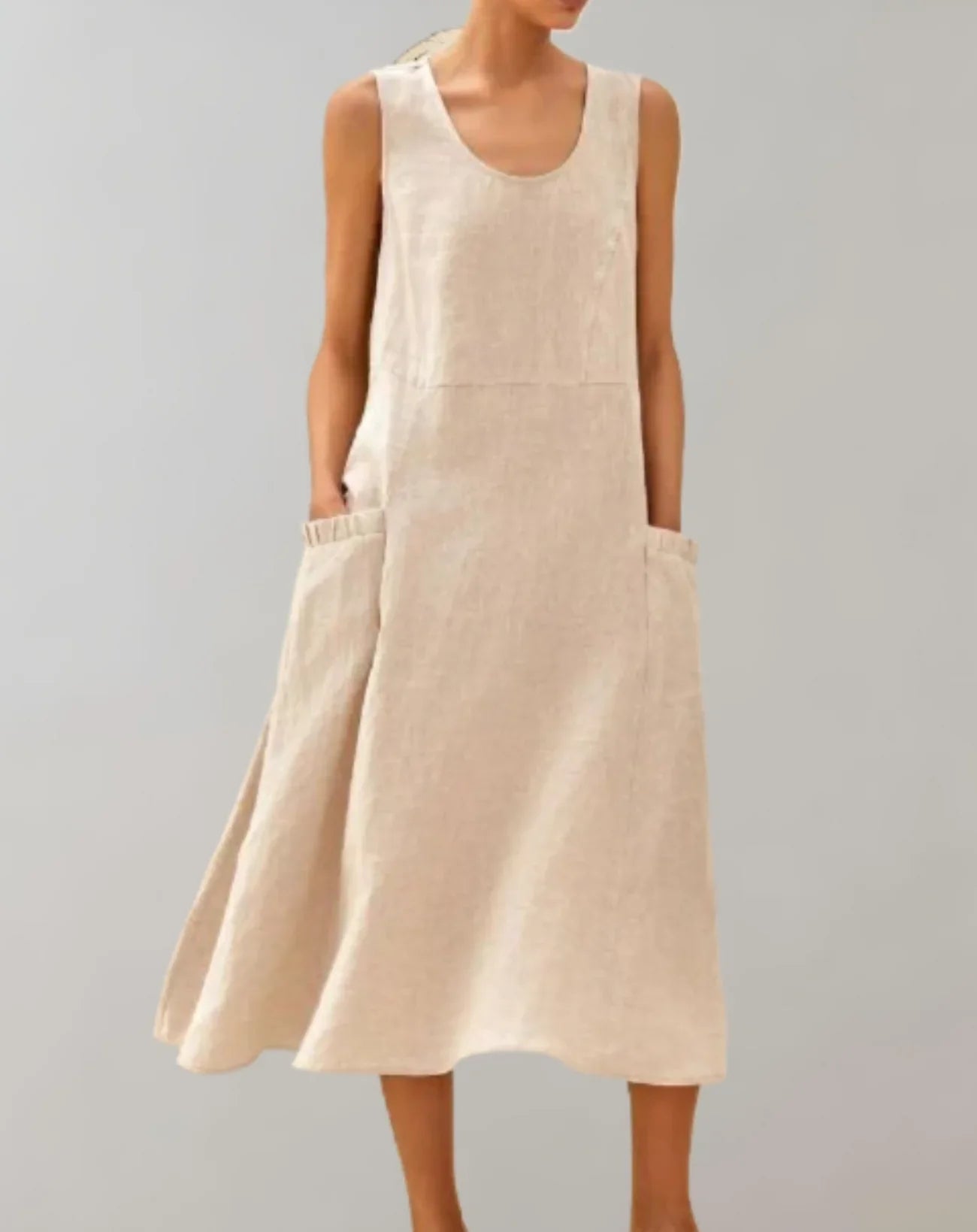 Dieses ärmellose Midikleid aus einer hochwertigen Leinen-Baumwoll-Mischung ist besonders atmungsaktiv und fühlt sich leicht und natürlich an. Die entspannte A-Linien-Silhouette, die durch einen U-Ausschnitt und dezente Nahtdetails akzentuiert wird , sorgt für mühelosen Komfort und Stil.